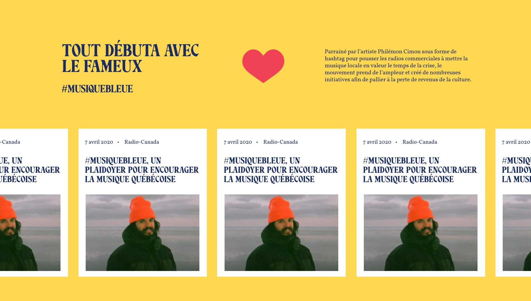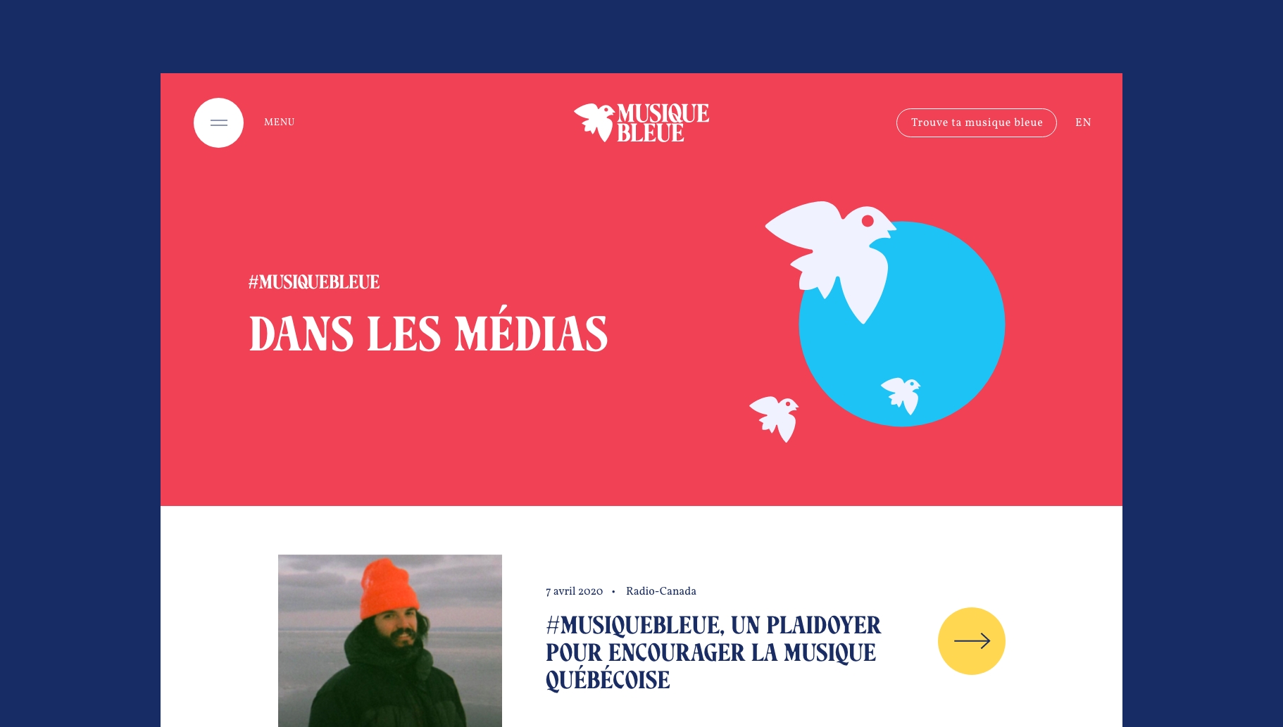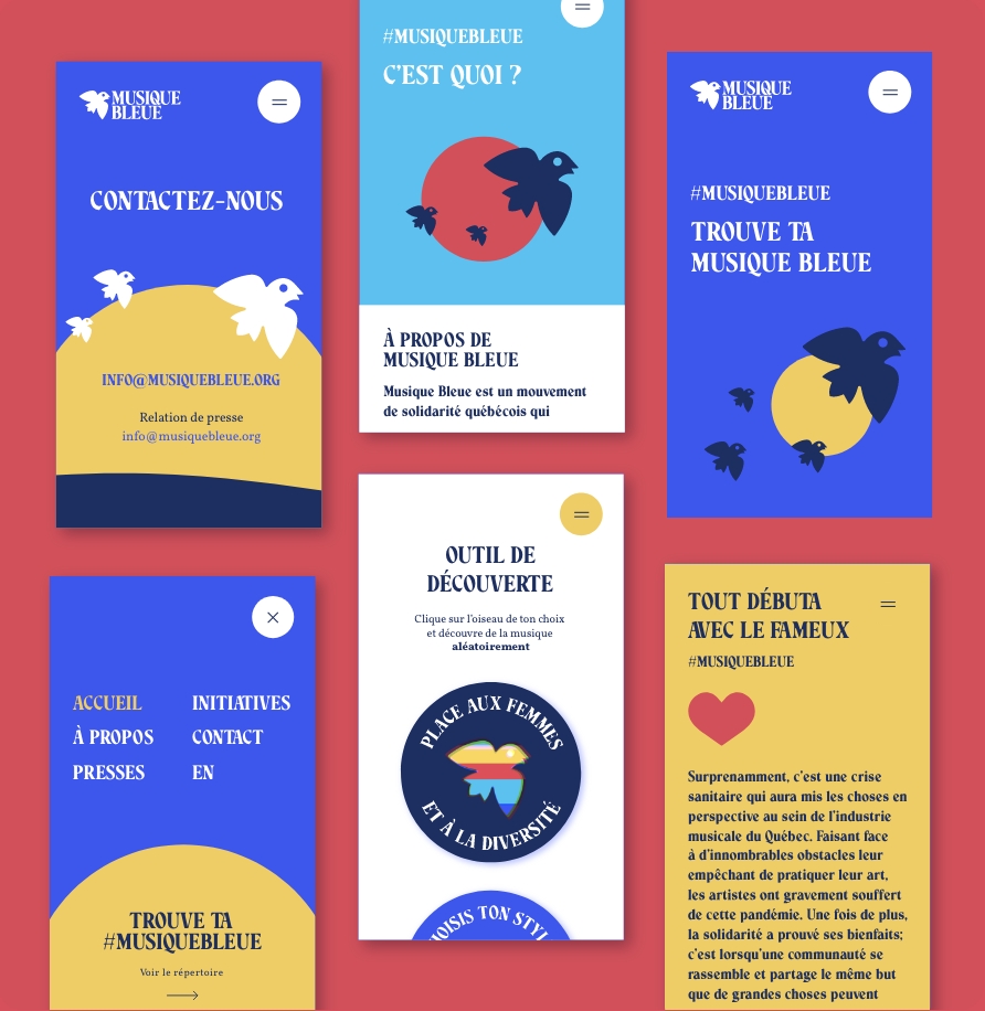 Dans le cadre de ce mandat, j’ai accompagné Musique Bleue, une plateforme visant à encourager l’écoute de musique québécoise durant la pandémie. En m’appuyant sur l’identité visuelle existante, j’ai conçu et intégré le site web de la plateforme, en veillant à offrir une expérience simple, fluide et accessible. L’objectif était de mettre en valeur les artistes et le contenu tout en assurant une navigation intuitive et une cohérence graphique fidèle à l’univers déjà établi.