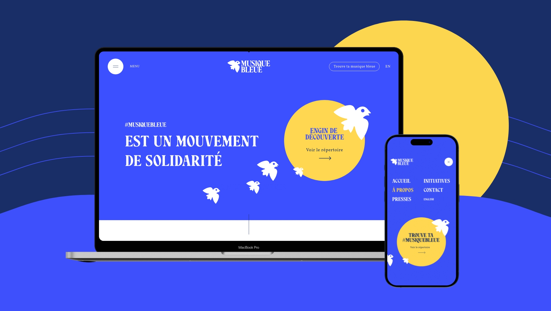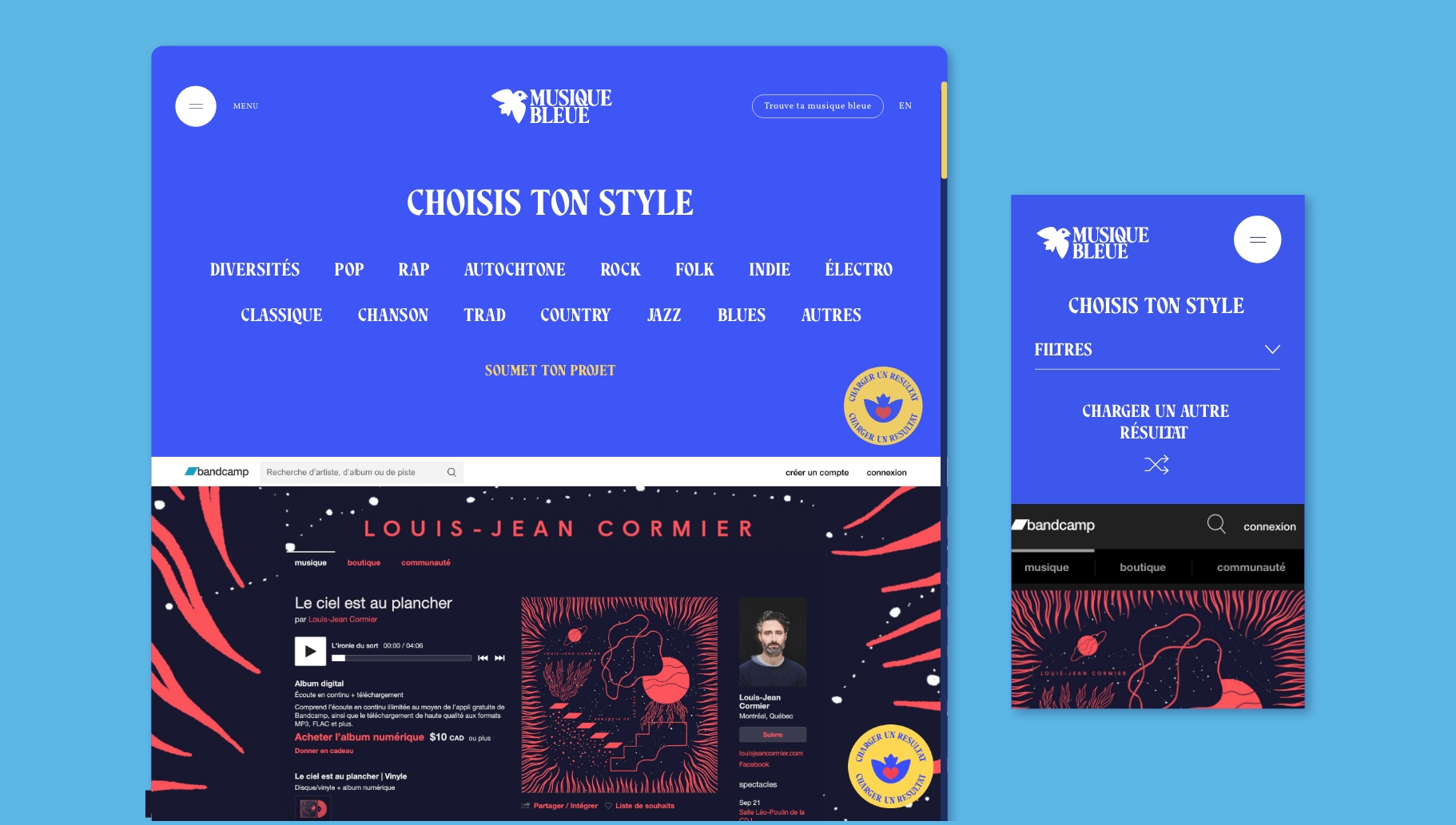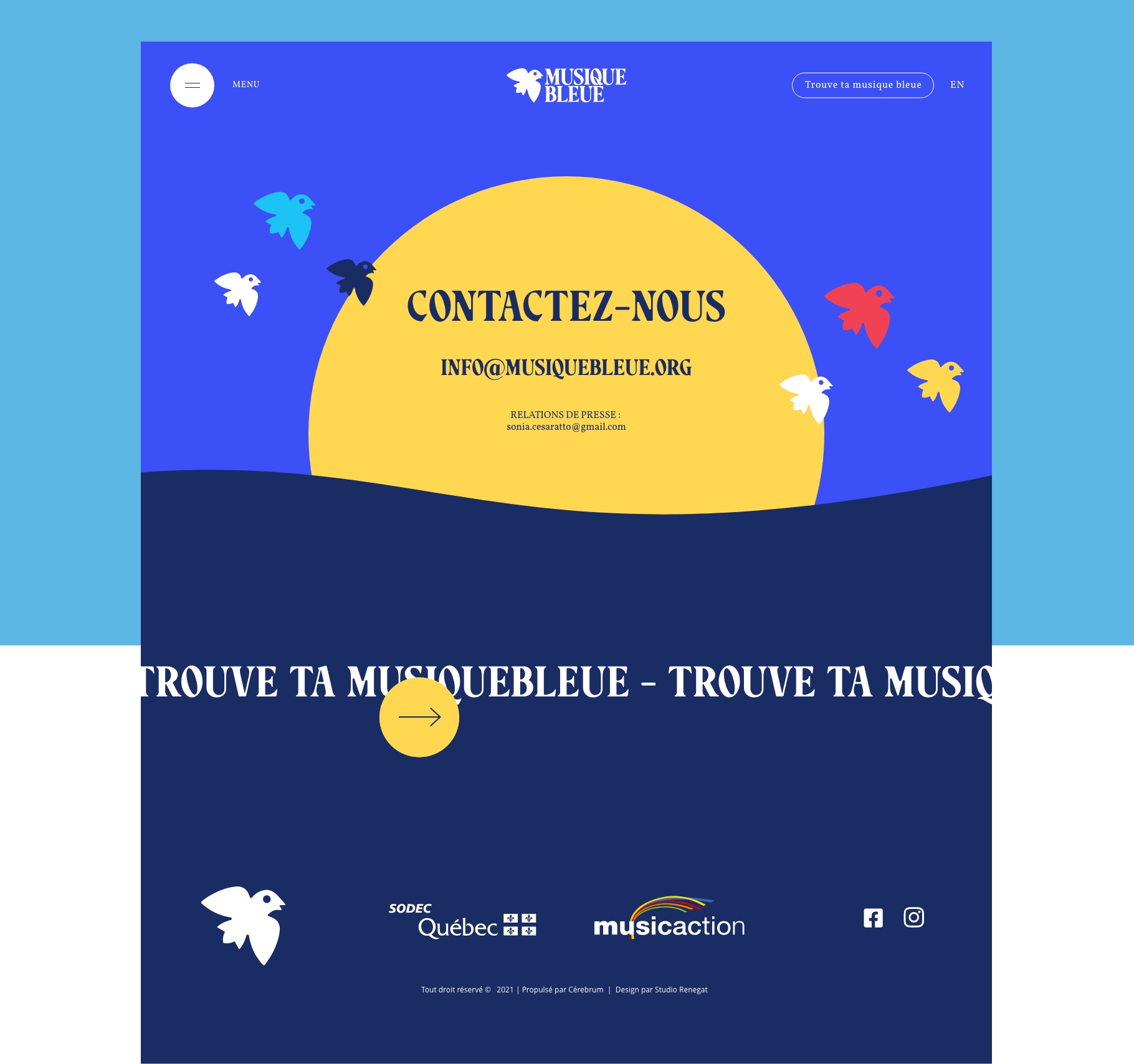 Dans le cadre de ce mandat, j’ai accompagné Musique Bleue, une plateforme visant à encourager l’écoute de musique québécoise durant la pandémie. En m’appuyant sur l’identité visuelle existante, j’ai conçu et intégré le site web de la plateforme, en veillant à offrir une expérience simple, fluide et accessible. L’objectif était de mettre en valeur les artistes et le contenu tout en assurant une navigation intuitive et une cohérence graphique fidèle à l’univers déjà établi.