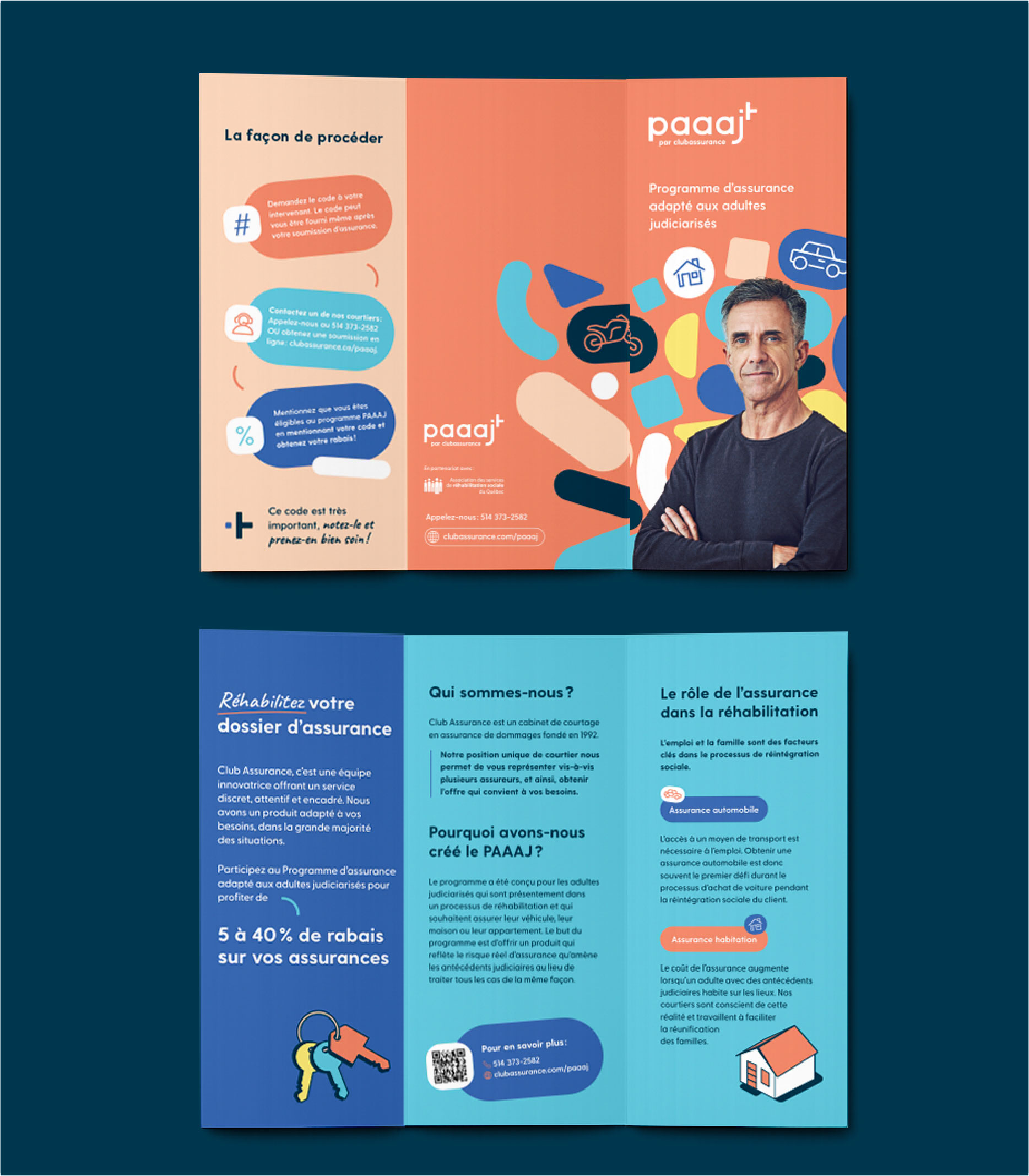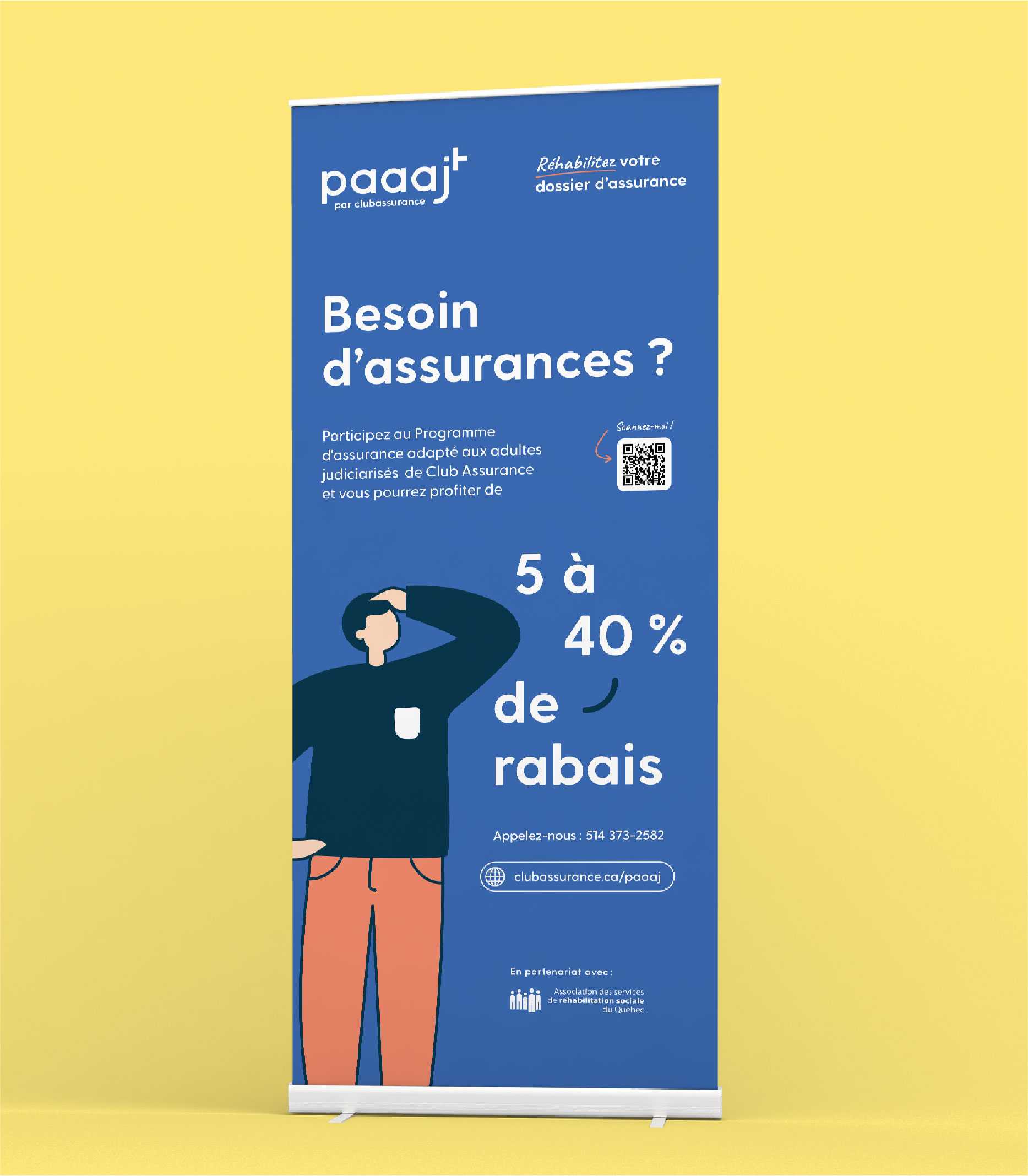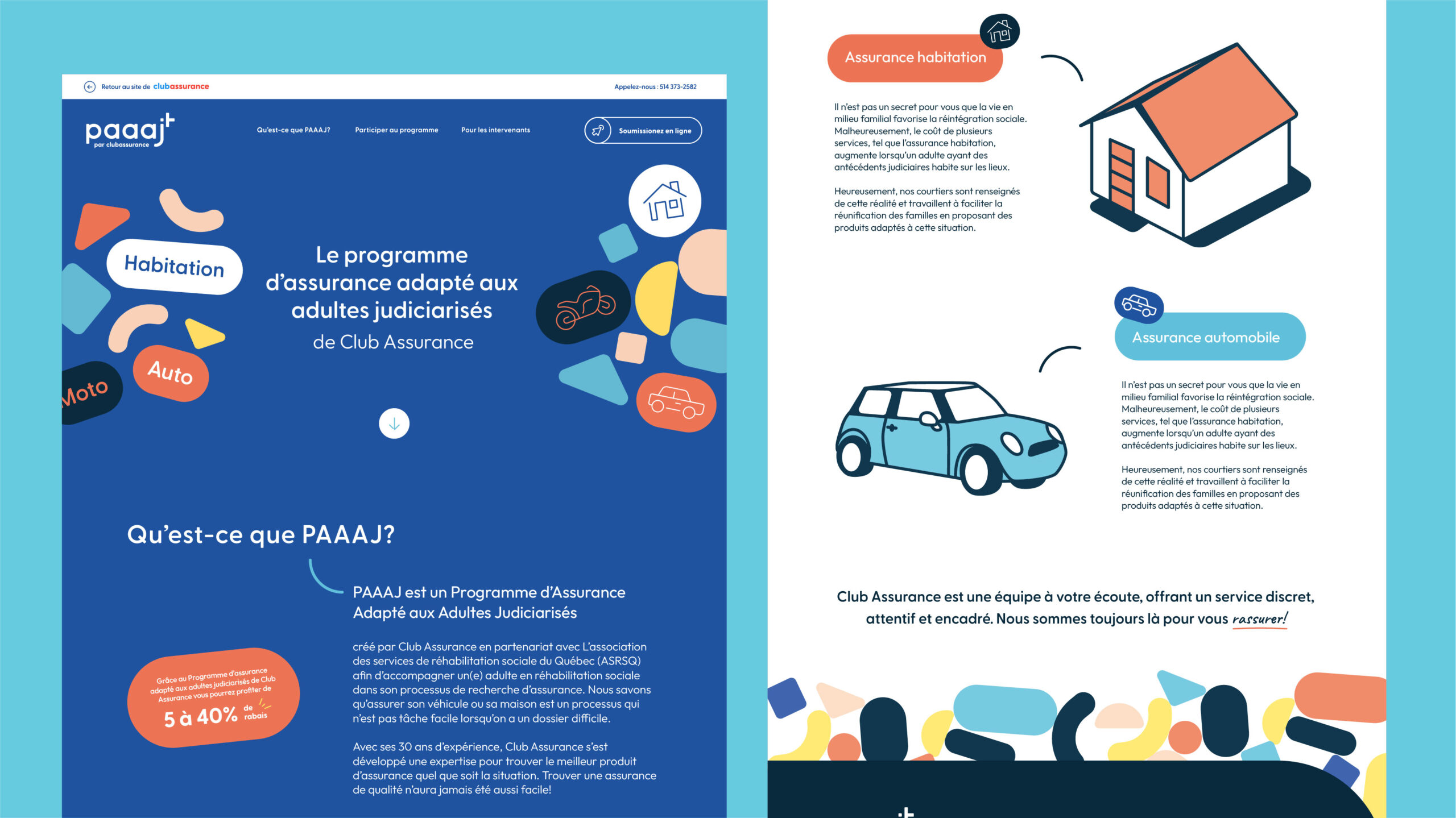 Dans le cadre de ce mandat, j’ai conçu l’identité visuelle du programme PAAAJ (Programme d’Assurance Adapté aux Adultes Judiciarisés), avec l’objectif de créer un univers graphique à la fois humain, accessible et cohérent. Le travail s’est décliné par la création d’illustrations personnalisées en lien avec cet univers, ainsi que par la conception de supports de communication tels que des affiches, dépliants et banderoles publicitaires. J’ai également réalisé le design de la landing page, assurant une continuité visuelle et narrative sur l’ensemble des points de contact du programme.