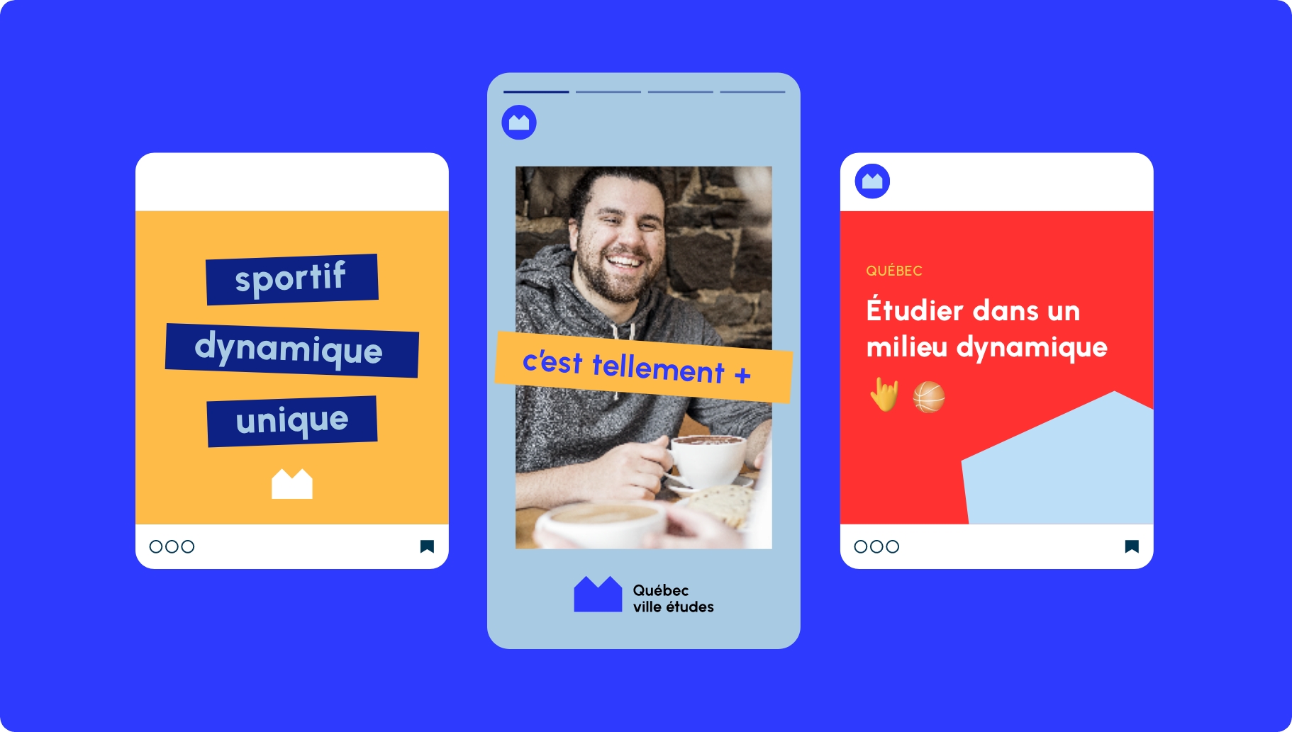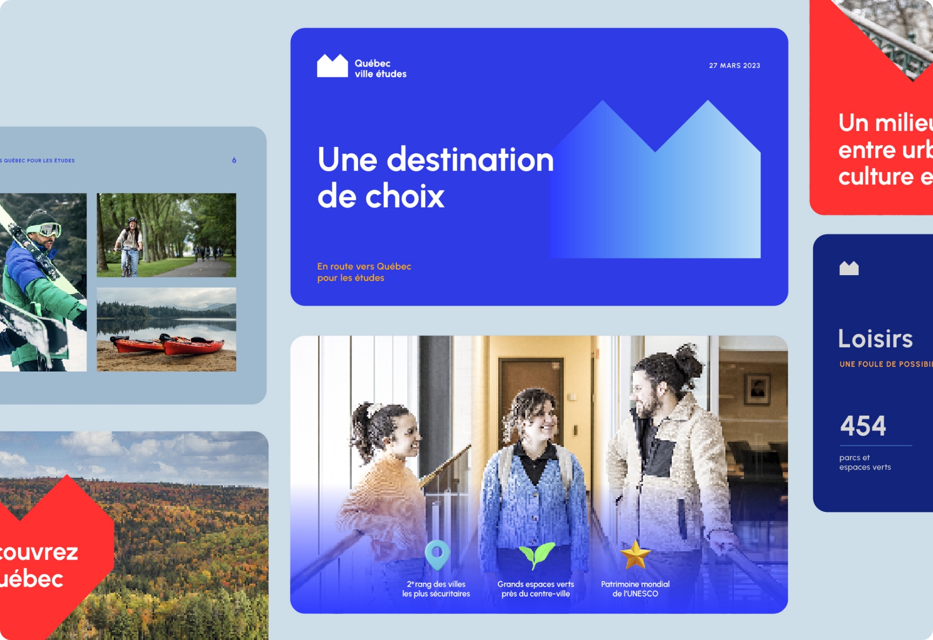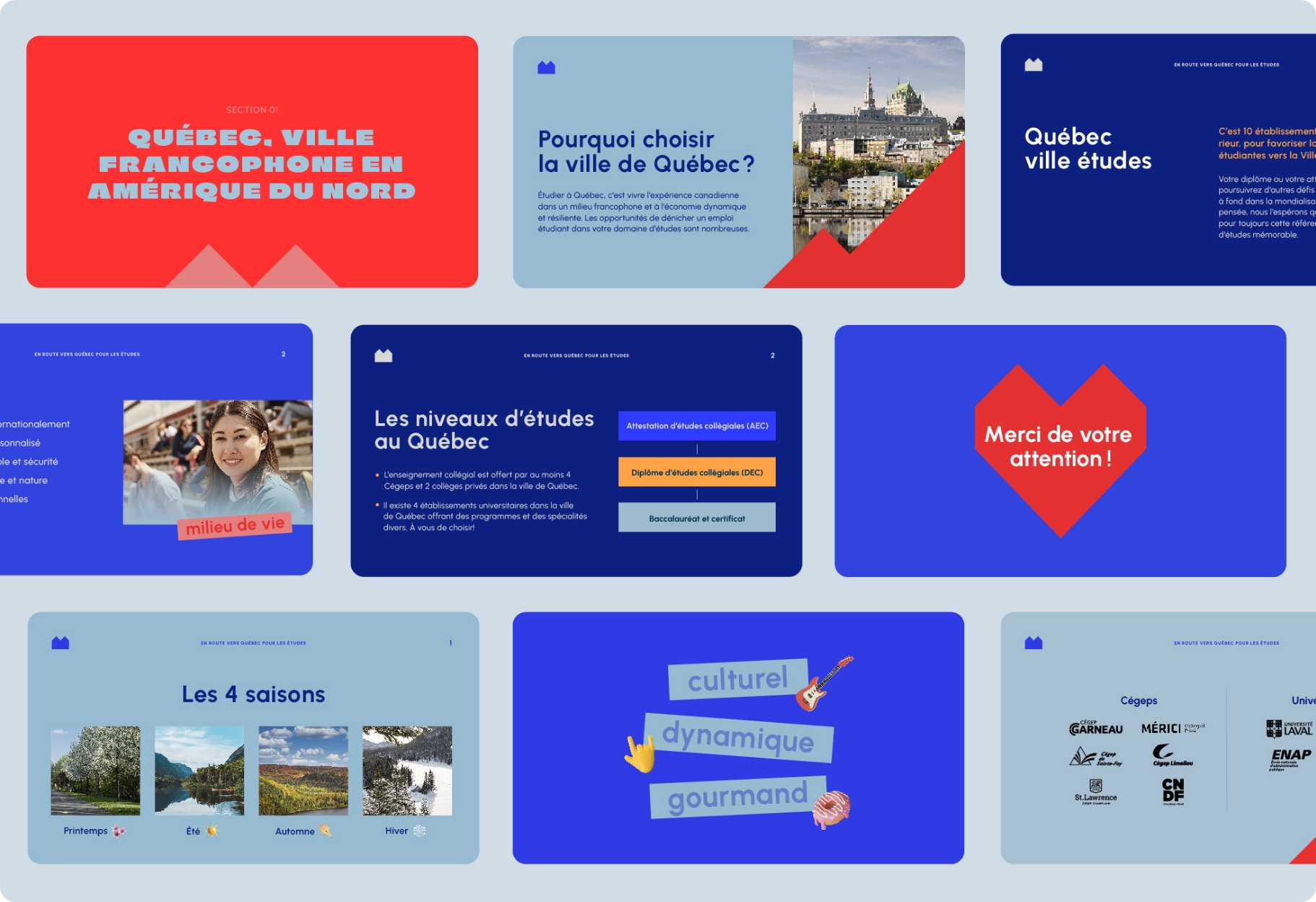 Dans le cadre de ce mandat, j’ai accompagné Québec Ville Études, une marque propulsée par le Pôle régional en enseignement supérieur de la Capitale-Nationale, dont la mission est d’outiller les étudiants étrangers et de les guider efficacement dans leur projet d’études à Québec. À partir du logo existant, le mandat consistait à définir l’image de marque et à développer un univers graphique distinctif et cohérent. J’ai conçu la charte graphique, établi la palette de couleurs et décliné l’identité à travers divers supports, incluant des visuels pour les réseaux sociaux, des banderoles et objets promotionnels, des animations en motion design ainsi que des visuels de présentation PowerPoint.